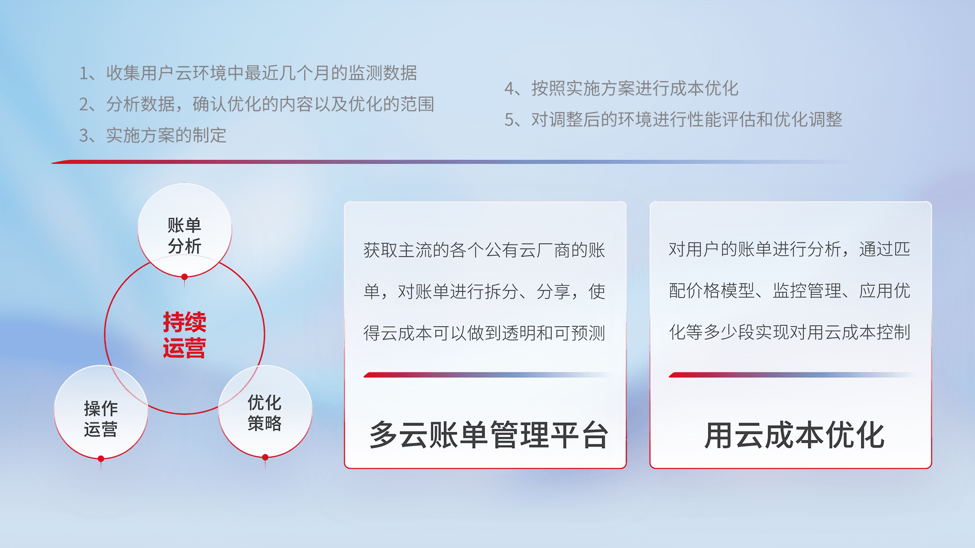 通过多云纳管,,以统一的资源数据模型把客户的云资源进行抽象和封装,,,,进而实现对多云资源的统一操作,,,保障云资源管理的可靠性、、稳定性与可用性。。量身定制化运维内容,,,配置、、、开发运维、、、、补丁管理、、、、备份、、、监控、、认证和访问管理、、、审计和日常巡检等,,,保障在用云过程中的可靠度,,稳定度以及高可用率。。。